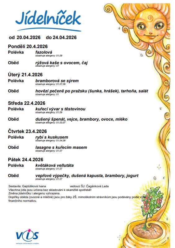 Všechna jídla jsou určena ihned ke spotřebě. Čísla v závorce označují přítomnost alergenu v pokrmu viz. Seznam alergenů. Změna jídelníčku a alergenu vyhrazena. Doplňky oběda /mléčné a ovocné/ jsou pro žáky ZŠ, mimoškolním strávníkům jsou podávány podle finančního limitu.