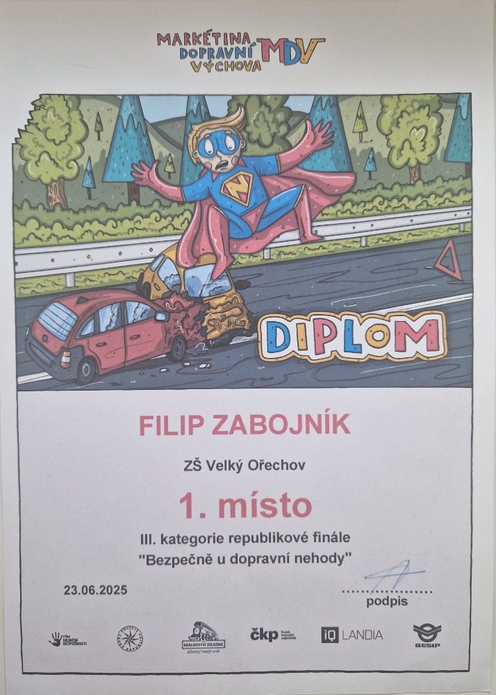 Naši školu reprezentoval Filip Zábojník, žák 9. ročníku ZŠ Velký Ořechov. Ze všech zaslaných výtvarných a literárních děl, kterých bylo neuvěřitelných 2 500, byl právě Filip vybrán jako vítěz 1. místa v kategorii 2. stupně základních škol.